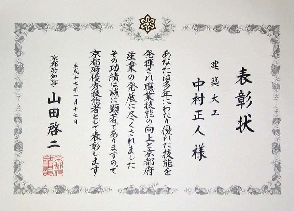 常務取締役 中村正人氏 京都府優秀技能者表彰
